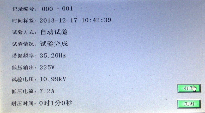 當(dāng)U諧振電壓降壓0時,試驗完成,如想查詢試驗記錄,請在降壓前點擊保存數(shù)據(jù),降壓后點擊“文件管理”; 顯示界面如圖所示。