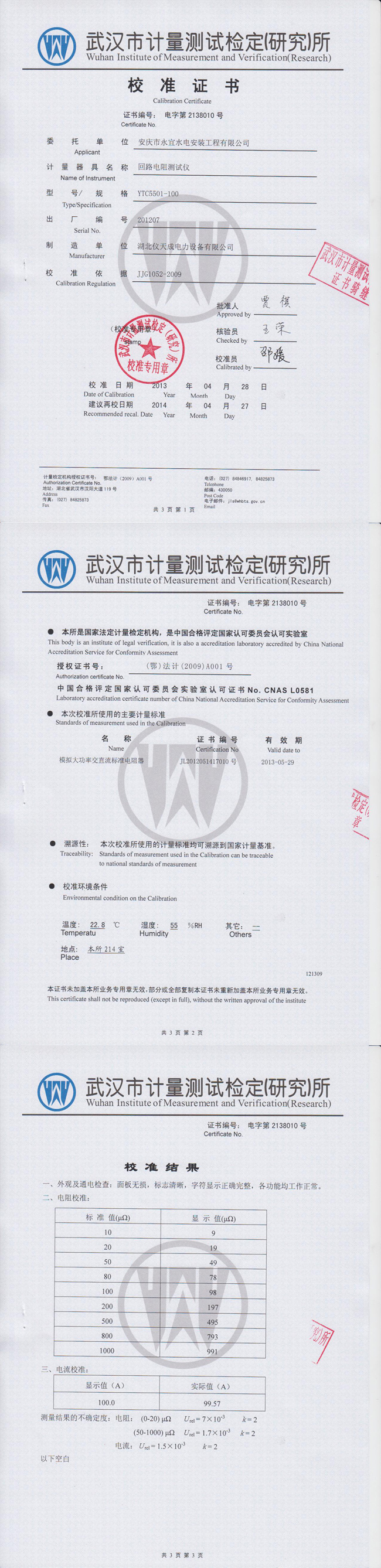 轉(zhuǎn)載:"YTC5501-100回路電阻測試儀資質(zhì)證書" 請注明來源于儀天成電力。 更多技術問題請致電儀天成電力客戶服務:027-87876585,技術部專線:027-87876585,在線客服:719388481